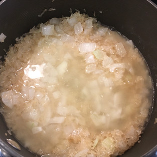 It turns out that this was an incredibly easy way to make Spanish Rice and it even used a rice cooking technique I learned from Julia Child when I made Risotto for the first time. After chopping up a small onion, it was cooked in about two tablespoons of oil until tender. That, by the way, was about the hardest part of this entire recipe! I then added 1 1/2 cups of uncooked rice an sauteed it with the onions for a couple of minutes. This cooks the starch coating of the rice to keep it from turning into "sticky" rice. You'll notice the rice grains turn an almost translucent color as it cooks.