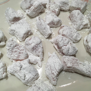 As soon as the chicken was ready to cook it was set aside while I mixed the ingredients for the sauce. The rice vinegar, soy sauce, hoisin sauce (what's a hoisin? Hmmm, a good question for another post), water, sugar, and the cornstarch were combined and then set aside. It gets to be cooked in the same pan as the chicken once the chicken is ready. Now, back to the chicken!