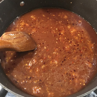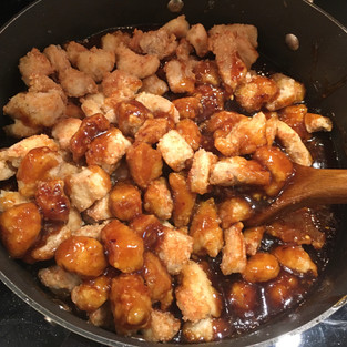 All that was left was putting the sauce and chicken together and tossing them around until the chicken was evenly coated with the sauce. Of course, you'll want to snitch a few pieces to make sure it is ready but be careful -- you'll need to leave some for everyone else too!