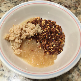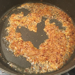 The oil went into a pan and, when hot, the chicken was cooked until the pieces were golden brown on all the sides. As soon as the chicken was cooked I put in in a mixing bowl while I finished up the sauce. Most of the remaining oil in the pan was drained until there was only about a tablespoon left in the pan into which I added the garlic, chili flakes, and ginger. They were sauteed together for just about 30 seconds to help them get to know each other and to release their flavors. Then came the home stretch as the rest of the sauce ingredients were poured into the pan and brought to a simmer for a couple of minutes until it thickened into an awesome sauce ready for the chicken to hop in.
