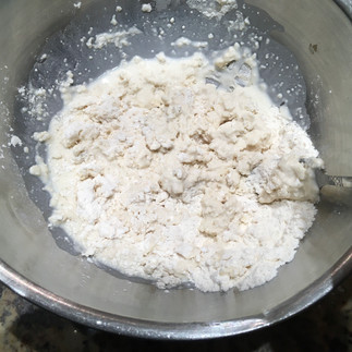 It was an interesting process, I've never done or seen anything like it before, but it pretty much worked out. I kept pinching and rubbing the blobs of shortening with flour until everything was pretty well mixed together. In order to make things sticky again -- why is it that everything about working with dough seems to be sticky? -- it was time to add the milk. The milk was poured in and stirred with a fork until I ended up with a sticky blob of dough.