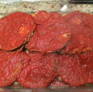 Lots of ingredients and a bit of work to make this but it was worth it. First, the eggplants were sliced, placed on a layer of paper towels and gently seasoned with some of the salt. The slices were laid flat in layers with a layer of paper towels between each. After all of the slices were laid out and sprinkled with salt, the top layer was covered with another paper towel and a small cookie sheet placed on top to add a bit of weight. This was all set aside for about an hour while I worked on preparing the bread crumbs and sauce.