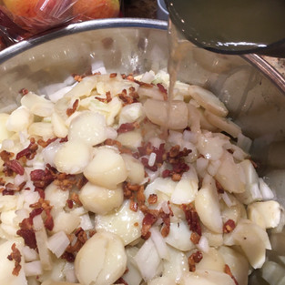 As the peeling progressed, with about each 1/4 of the potatoes in a large mixing bowl I would add about 1/4 of the diced onions and fresh bacon bits. Those layers just made it easier to evenly mix everything together without breaking up the potatoes too much. After all of the layers were finished, 2 tablespoons of basalmic vinegar plus the warm bacon drippings were drizzled over the potatoes/onions/bacon as they were being gently mixed together with some chopped parsley.
