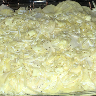 Once again, since Julia has given permission, I was able to speed up the preparation of this dish but putting our food processor to work to slice the potatoes. The longest part of the preparation was peeling the 2 pounds of potatoes needed but I'm getting to be a pretty good potato peeler. Fingertips and knuckles had all their skin intact when I finished so I'm making progress! I'm afraid no disasters befell me this time so I'm just going to give you a quick rundown on how to make these.