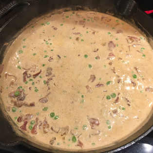 As the sauce approached the thickness I wanted, I added about 1/2 cup of frozen peas and the bacon I'd cooked at the beginning. Finally, the torellini was drained when it was ready and then added into the sauce.