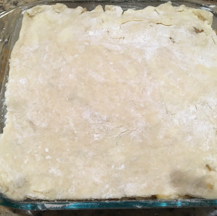 Once everything was thoroughly mixed, Julia kept screaming for me to put the paste in the fridge for a couple of hours but I went straight to a lightly floured pastry mat and began rolling it out with a rolling pin. My rolling pin has these really cool changeable spacers on the end (hmmm, I should have taken a photo) so I can set the height. I set it for 1/8" and rolled the dough out so it'd be a little bigger than the 9" baking dish. Then, using my calibrated eyeballs, I cut out a 9x9 square and transferred it on top of the apples in the baking dish.